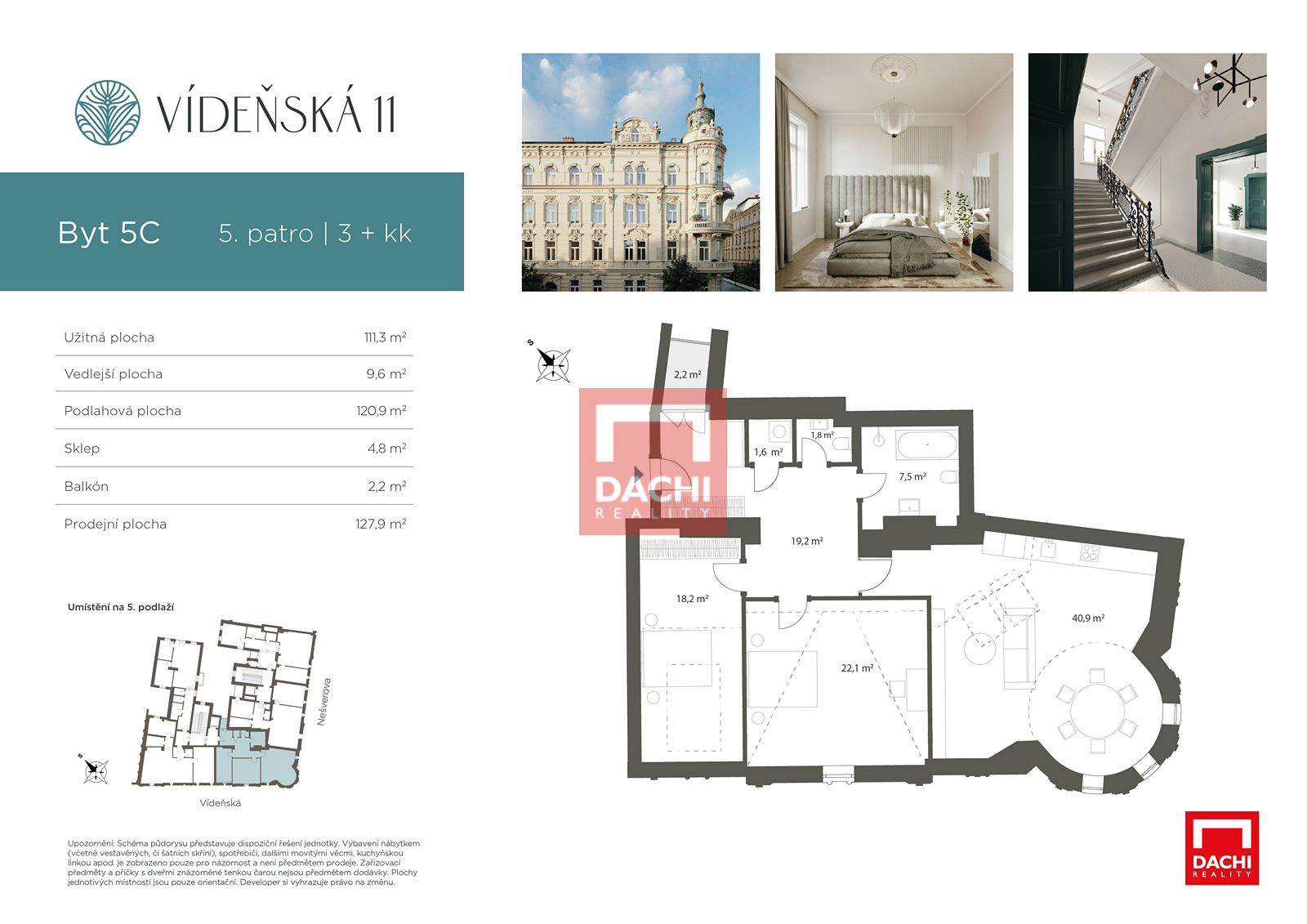 Historie, styl a naprostý klid - to vše nabízí byty v exkluzivním projektu Vídeňská. Nabízíme Vám jako výhradní prodejce naprosto výjimečný penthouse 3+kk v nejvyšším podlaží rezidence Vídeňská 11. Tento podkrovní byt o podlahové ploše 120,9 m2 se nachází v 5. podlaží historické budovy z roku 1899. Jeho naprostou raritou je architektonicky výrazná věžička, která tvoří výjimečný a inspirativní prvek interiéru. Nabízí se zde možnost vybudovat druhé patro, které může sloužit jako relaxační kout, domácí knihovna nebo klidová zóna - jde o prostor s velkým potenciálem a charakterem, jaký se opravdu jen tak nevidí. Byt je orientován na jihozápad, díky čemuž je během dne krásně světlý. Podkrovní okna zajišťují dostatek denního světla, které podtrhuje vzdušnost a jedinečnost celého prostoru. Dispozice je promyšlená a atmosféra bytu vyniká osobitostí, kterou nenajdete v žádné novostavbě. K bytu náleží také balkon o výměře 2,2 m2, orientovaný do klidného vnitrobloku - ideální pro soukromé posezení. Samozřejmostí je také plně integrovaná klimatizace a elektrické žaluzie u stropních oken, které zajišťují maximální komfort a kontrolu nad světlem i teplotou interiéru. Součástí bytu je exkluzivní vybavení včetně koupelen Gessi, osvětlení Modular, podlah Foglie D’Oro od českých mistrů Valen&Masar a prémiové keramiky značky Porcelanosa. Součástí každého bytu ve Vídeňské 11 je praktický sklep. K tomuto konkrétnímu bytu náleží sklep o velikosti 4,8 m2, který doplňuje byt o potřebný úložný prostor. U nabídky naleznete video, které zachycuje atmosféru rezidence a záběry z více bytových jednotek. Slouží k představení celkového charakteru nemovitosti. Pro vaši lepší představu také mohou některé fotografie zobrazovat vybavený interiér vytvořený pomocí AI - jedná se o inspirativní vizualizace, nikoliv aktuální stav bytu. Byt je ihned k nastěhování a kdykoliv k dispozici k osobní prohlídce. Ozvěte se nám. Vídeňská 11 není jen bydlení - je to prostor pro výjimečný způsob života.