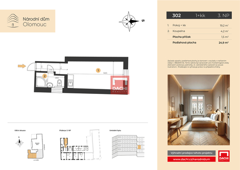 Nabízíme vám jako výhradní prodejce jedinečnou příležitost stát se součástí unikátního rezidenčního projektu, který vdechuje nový život architektonicky cenné budově historického Národního domu v Olomouci. Tento ikonický dům vstupuje do nové éry - v jeho prostorách vznikají desítky moderních bytových jednotek, které citlivě propojují historické kouzlo s komfortem současného bydlení. V rámci projektu nabízíme byt č. 302 o dispozici 1+kk s podlahovou plochou 24,9 m2, který se nachází ve 3. nadzemním podlaží. Byty jsou navrženy s důrazem na kvalitu, eleganci a funkčnost - samozřejmostí jsou kvalitní podlahy, designové interiérové prvky a moderně vybavené koupelny. Historický Národní dům byl od svého vzniku dějištěm významných společenských a kulturních událostí, jichž se účastnily přední osobnosti českých dějin, včetně T. G. Masaryka. Díky tomu má celý objekt nezaměnitelnou atmosféru a historický odkaz, který dodává novému bydlení jedinečný charakter. K výjimečné atmosféře domu přispívá také stylová kavárna a restaurace v přízemí, které vytvářejí příjemné zázemí nejen pro rezidenty, ale i jejich hosty. Díky prestižní poloze v samotném centru města, v těsné blízkosti památek, oblíbených restaurací a kulturních institucí, představuje projekt nejen komfortní místo pro život, ale také mimořádně atraktivní investiční příležitost. Hledáte-li byt s jedinečným charakterem v historickém domě, kde se noblesní atmosféra minulosti snoubí s moderním stylem života, neváhejte nás kontaktovat. Rádi vám projekt osobně představíme.
