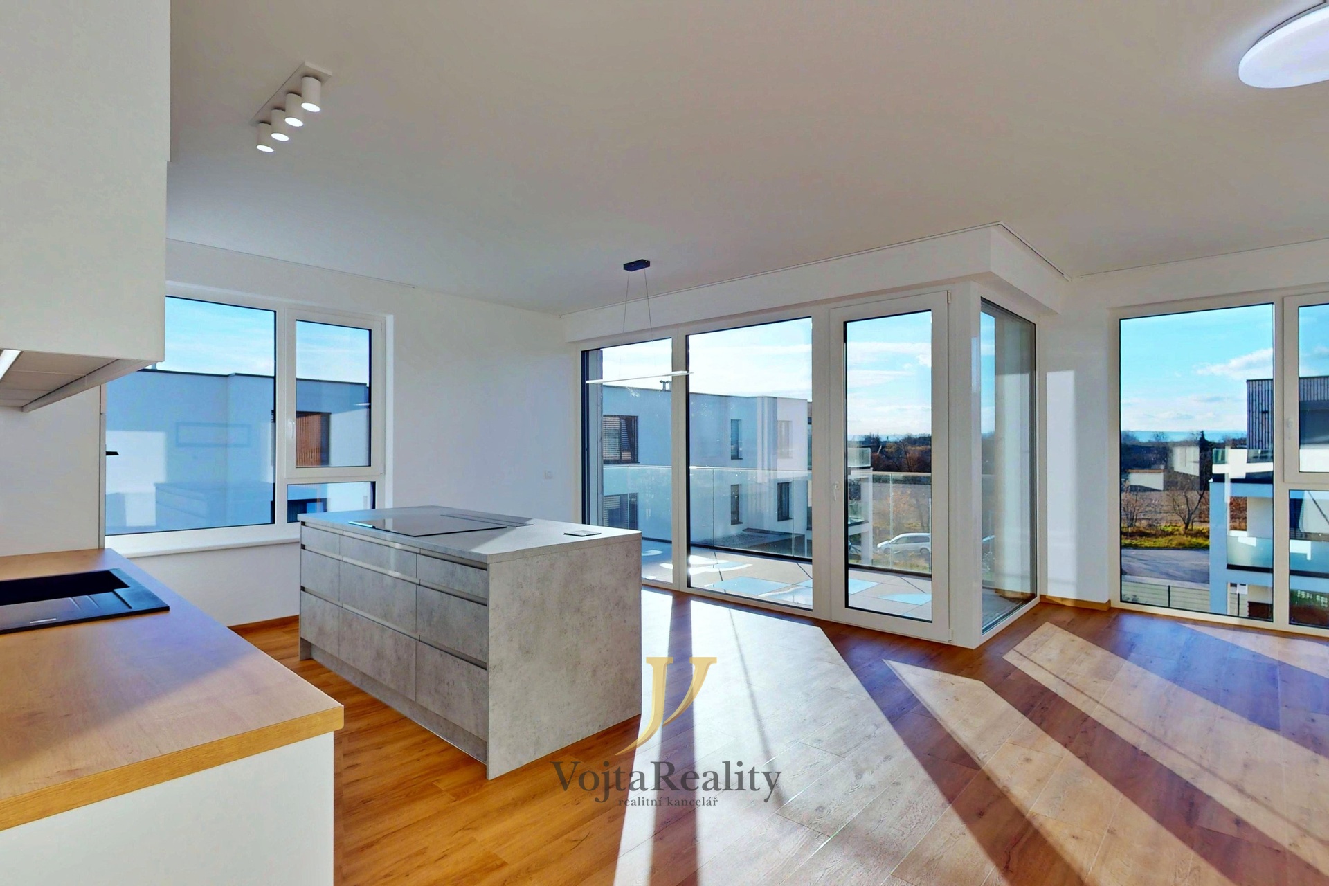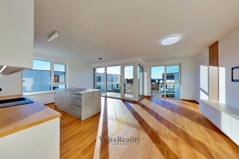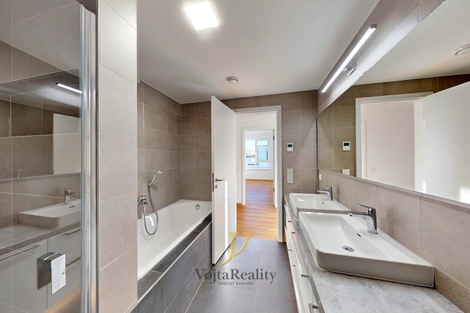 Ve výhradním zastoupení nabízíme k pronájmu nadstandardní byt 4+kk o užitné ploše 114 m2, umístěný v posledním třetím podlaží moderní rezidenční výstavby Vila Park na ulici Milana Ticháka. Součástí bytu jsou dvě terasy o celkové ploše 18 m2, dva sklepy o velikosti 9,5 m2 a 8,8 m2 a dvě garážová parkovací stání s přípravou pro instalaci rychlonabíjecí stanice. Dispozice bytu je navržena s důrazem na komfort, funkčnost a dostatek úložného prostoru. Vstupní chodba je vybavena vestavěným nábytkem s nočním osvětlením. Obývací pokoj je propojen s moderní kuchyní, která nabízí kuchyňský ostrůvek s indukční varnou deskou a výsuvnou digestoří, nadstandardně velkou lednicí s mrazákem a kompletní sadu spotřebičů. Ložnice disponuje vestavěným úložným nábytkem na míru a přímým vstupem na vlastní terasu. Další dva pokoje lze využít jako dětský pokoj a pracovnu. Koupelna je vybavena vanou, sprchovým koutem, dvojitým umyvadlem a úložnými prostory. Samostatná toaleta nabízí bidetové WC a malé umyvadlo. Praktickou součástí bytu je technická místnost s rekuperační jednotkou, která zároveň poskytuje prostor pro pračku, sušičku i další skladování. Byt je orientován na východ, jih a západ, což zajišťuje dostatek světla po celý den. Nadstandardní provedení zahrnuje podlahové topení v celém bytě, vinylové podlahy, bezfalcové interiérové dveře, rekuperaci ve všech místnostech, termostat v každém pokoji, venkovní žaluzie s dálkovým ovládáním i možností řízení přes Somfy TaHoma. Dále jsou k dispozici elektrické markýzy na obou terasách, chytré WiFi osvětlení, chytrý zvonek, instalované garnýže, sítě proti hmyzu a elegantní TV stěna s LED podsvícením v obývacím pokoji. Lokalita Tabulový Vrch patří mezi nejvyhledávanější části Olomouce díky klidnému prostředí, moderní zástavbě a kompletní občanské vybavenosti. V docházkové vzdálenosti se nachází školy, školky, obchody, restaurace, sportoviště i zastávka MHD. Velkou výhodou je také rychlé napojení na obchvat a hlavní dopravní tahy. Majitel požaduje vratnou kauci 50 000 Kč. Provize realitní kanceláře činí jeden měsíční nájem + DPH. Byt je k dispozici dle dohody. V případě zájmu o prohlídku či doplňující informace mě neváhejte kontaktovat - rád vás bytem osobně provedu.