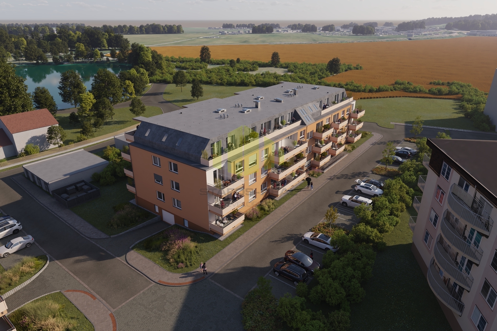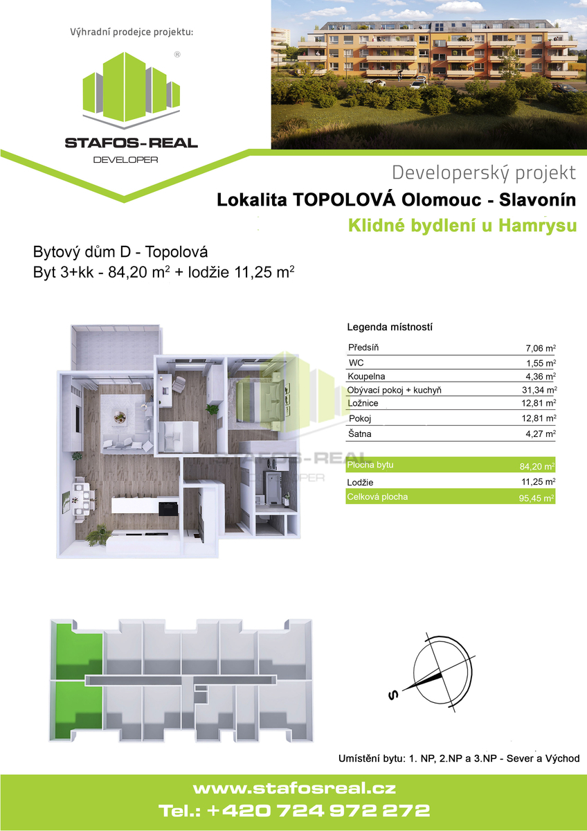 Nabízíme k pronájmu moderní byt 3+kk v kvalitní novostavbě, která byla právě zkolaudována a nachází se v klidné lokalitě na ulici Topolová v oblíbené městské části Slavonín. Dům je situován v bezprostřední blízkosti rybníka Hamrys a nedaleko zastávek MHD, což zajišťuje ideální kombinaci klidného bydlení v zeleni a rychlé dostupnosti centra Olomouce. Byt se nachází v 3. nadzemním podlaží, má podlahovou plochu 84,2 m2 a disponuje prostornou lodžií o výměře 11,4 m2, přístupnou z obývacího pokoje. Celková plocha bytu činí 95,45 m2. Byt je orientován na severozápad a jeho dispozice zahrnuje obývací pokoj s kuchyňským koutem, dvěma ložnicemi, vstupní halu, velkorysou šatnu, koupelnu a samostatné WC. Kuchyňský kout je vybaven kuchyňskou linkou s indukční varnou deskou, elektrickou troubou, přípravou na myčku nádobí a samostatně stojící lednicí s mrazákem. V koupelně se nachází vana, umyvadlo, otopný žebřík a příprava pro pračku. Byt se pronajímá nevybavený, s výjimkou kuchyňské linky a spotřebičů. Standard bytu odpovídá současným nárokům na moderní bydlení - vinylové podlahy, okna s izolačním trojsklem, keramické obklady a dlažba v koupelně, stínicí prvky v podobě žaluzií či kolejnic pro závěsy, u vybraných bytů klimatizace. Dům je zařazen do energetické třídy B, nabízí bezbariérový přístup, moderní výtah, vysokorychlostní internet a zvýšený akustický komfort díky cihlovým příčkám AKUSYM. K bytu je možné si pronajmout vnitřní parkovací stání se sklepem v suterénu domu, případně také venkovní nezastřešené parkovací stání za závorou. Lokalita nabízí dětské hřiště, příjemné procházky kolem rybníka, dvě vyhlášené restaurace a kompletní občanskou vybavenost. Aquapark, nádraží i centrum města jsou dostupné během několika minut. Byt je nekuřácký, možnost chovu domácích mazlíčků je na vyžádání. Měsíční nájemné činí 20.700 Kč, zálohy na služby přibližně 3.500 Kč měsíčně, přičemž elektřina a internet nejsou v zálohách zahrnuty a hradí si je nájemce samostatně. Majitel umožňuje volbu zajištění závazků z nájemní smlouvy formou standardní vratné kauce ve výši trojnásobku měsíčního nájemného bez záloh, nebo prostřednictvím pojištění kauce společnosti CEE Specialty, které plně nahrazuje složení peněžní kauce. Pojistné činí 7 % ročně z pojistného limitu ve výši trojnásobku měsíčního nájemného bez záloh, minimální pojistný limit je 50.000 Kč s ročním pojistným 3.500 Kč. Přičemž majitel bytu preferuje formu pojištění kauce. Odměna realitní kanceláře činí jeden měsíční nájem + 21 % DPH. U zájemců prověřujeme evidenci exekucí, insolvencí a dluhů na zdravotním pojištění. Byt je k dispozici od února až března 2026. Pro lepší představu doporučujeme shlédnout fotodokumentaci a virtuální prohlídku vzorového bytu.