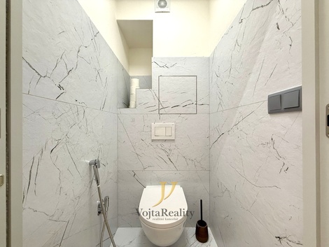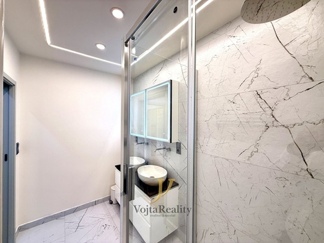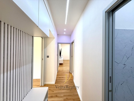 Nabízíme k pronájmu moderní byt o dispozici 3+kk s užitnou plochou 85 m2, který prošel kompletní a velmi kvalitní rekonstrukcí. Byt nabízí komfortní bydlení s důrazem na moderní technologie, design a praktické využití prostoru. Dispozice bytu tvoří prostorný obývací pokoj s kuchyňským koutem, dvě samostatné ložnice, chodba s dostatkem úložného prostoru, koupelna se sprchovým koutem a samostatné WC s hygienickou sprškou. V koupelně jsou dvě umyvadla s úložnými šuplíky, což zajišťuje pohodlí zejména pro vícečlennou domácnost. K bytu náleží také sklep o velikosti 2,5 m2. V domě je k dispozici kolárna a kočárkárna. Byt je vybaven řadou nadstandardních prvků. O komfort se starají odhlučněné stropy a kvalitní okna s trojskly. V obývacím pokoji je televize s úhlopříčkou 79 palců doplněná o sound systém. Vytápění je řešeno chytrými hlavicemi ovládanými přes mobilní aplikaci. Vstupní dveře mají elektronický zámek a video kukátko s přístupem přes aplikaci. Bezpečnost bytu zajišťuje systém Jablotron. Designové LED osvětlení umožňuje nastavení teploty světla pomocí ovladačů. V ceně nájmu je také Wi-Fi připojení. Kuchyňská linka je plně vybavena spotřebiči, mezi které patří myčka, sklokeramická varná deska, lednice s mrazákem, mikrovlnná trouba a horkovzdušná trouba. Byt nabízí také dostatek úložných prostor, například vestavěné skříně v chodbě a další skříně a komodu v pokojích. Součástí obývacího pokoje je také jídelní stůl se židlemi, který vytváří příjemný prostor pro společné stolování. Zálohy na služby činí přibližně 3 000 Kč měsíčně dle počtu osob. Elektřina bude přepsána na nájemce. Vratná kauce je ve výši dvou měsíčních nájmů. Provize realitní kanceláři činí jeden měsíční nájem + DPH. Byt je volný po dohodě, možné nastěhování ihned. V případě zájmu o více informací nebo sjednání prohlídky nás neváhejte kontaktovat.